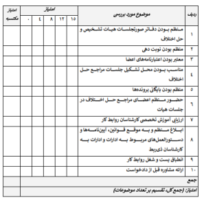 چنانچه تمام جلسات مراجع حل اختلاف با حضور همه اعضاء تشکيل گردد، امتیاز کامل لحاظ گردد، در صورتی که بعضی از جلسات به صورت نامنظم برگزار میگردد، متناسب با آن امتیاز کسر گردد.