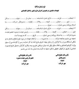 2- فرم شماره 1 (تغيير ساختار) پس از تکميل توسط کارفرما باید به تائید رئیس اداره بازرسی کار و مسئول پیشگیری از بیکاری کارگران (مسئول حمایت از مشاغل) و مدیر کل اجرايي رسيده باشد.